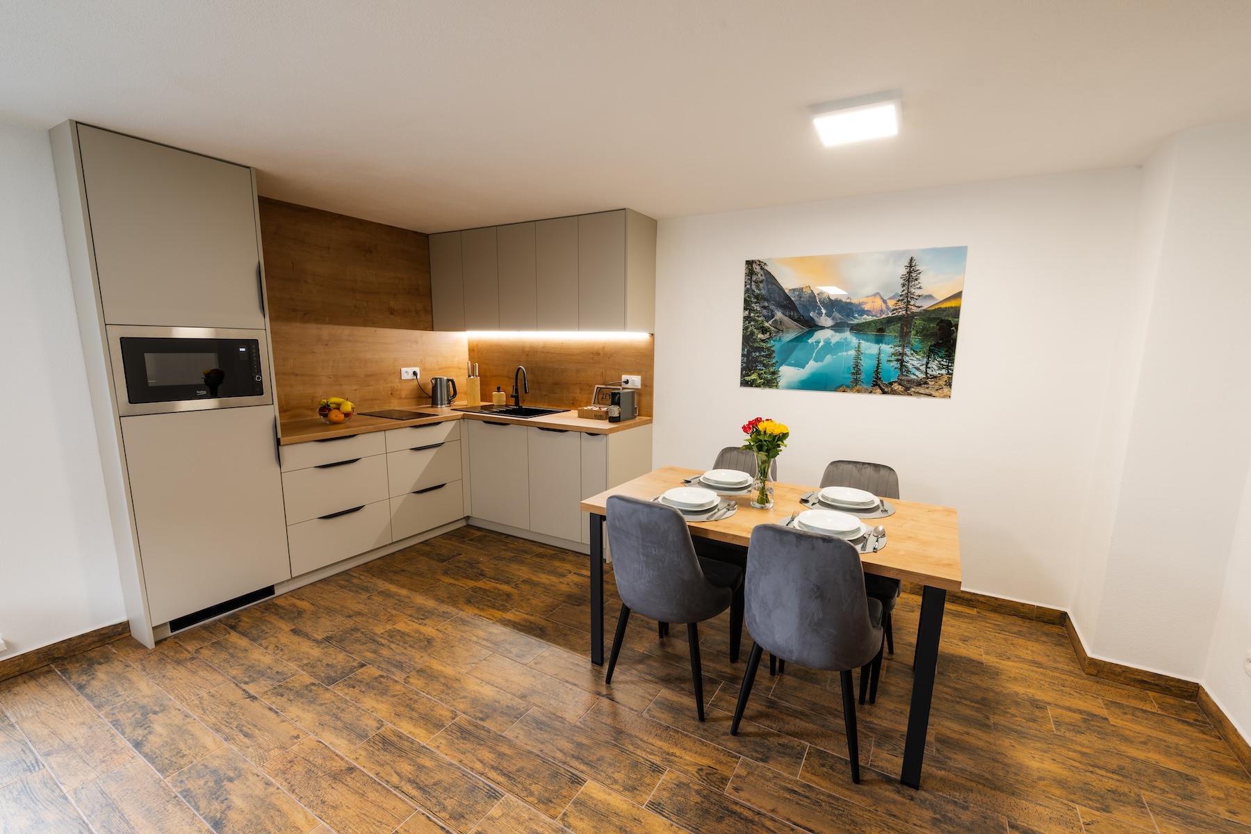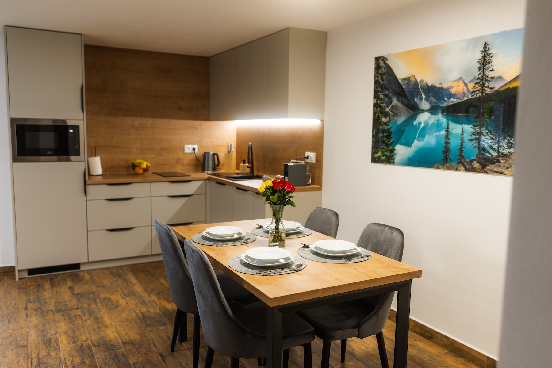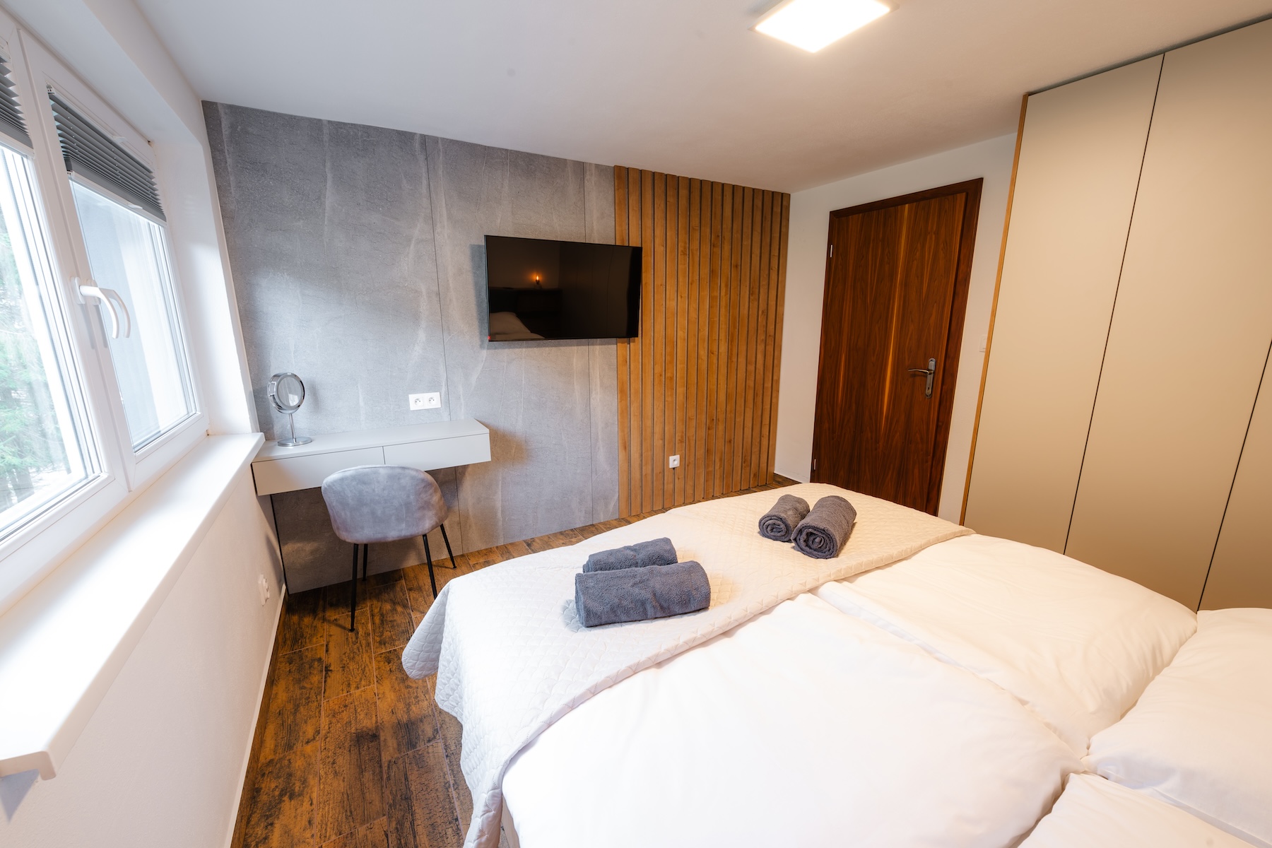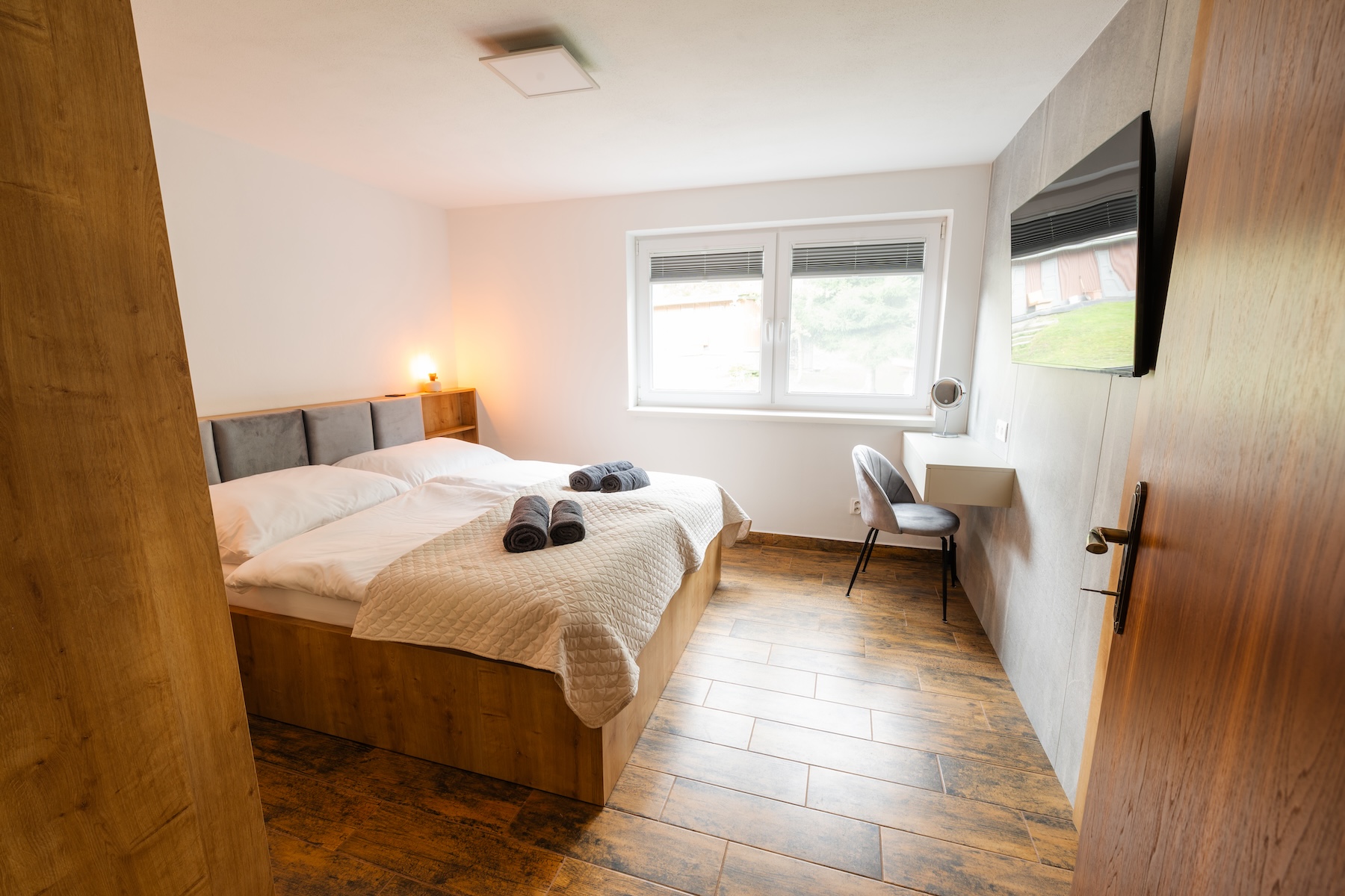 Apartmán Vám celoročne ponúka ubytovanie s kapacitou 3 dospelé osoby, prípadne 2 dospelé a 2 malé deti. Súkromie Vám poskytne presvetlený výklenok, v ktorom sa nachádza pohodlná vyvýšená manželská posteľ. V otvorenom priestore je gauč, s výhľadom na televízor, ktorý v noci po rozložení slúži ako plnohodnotná prístelka pre 1 dospelú osobu, prípadne 2 menšie deti. Počas pobytu máte k dispozícii komplet zariadenú kuchyňu s kávovarom, určite oceníte možnosť využiť minibar s rozmanitou ponukou alko a nealko nápojov. Najmä večer oceníte efektné podsvietenie celého priestoru.