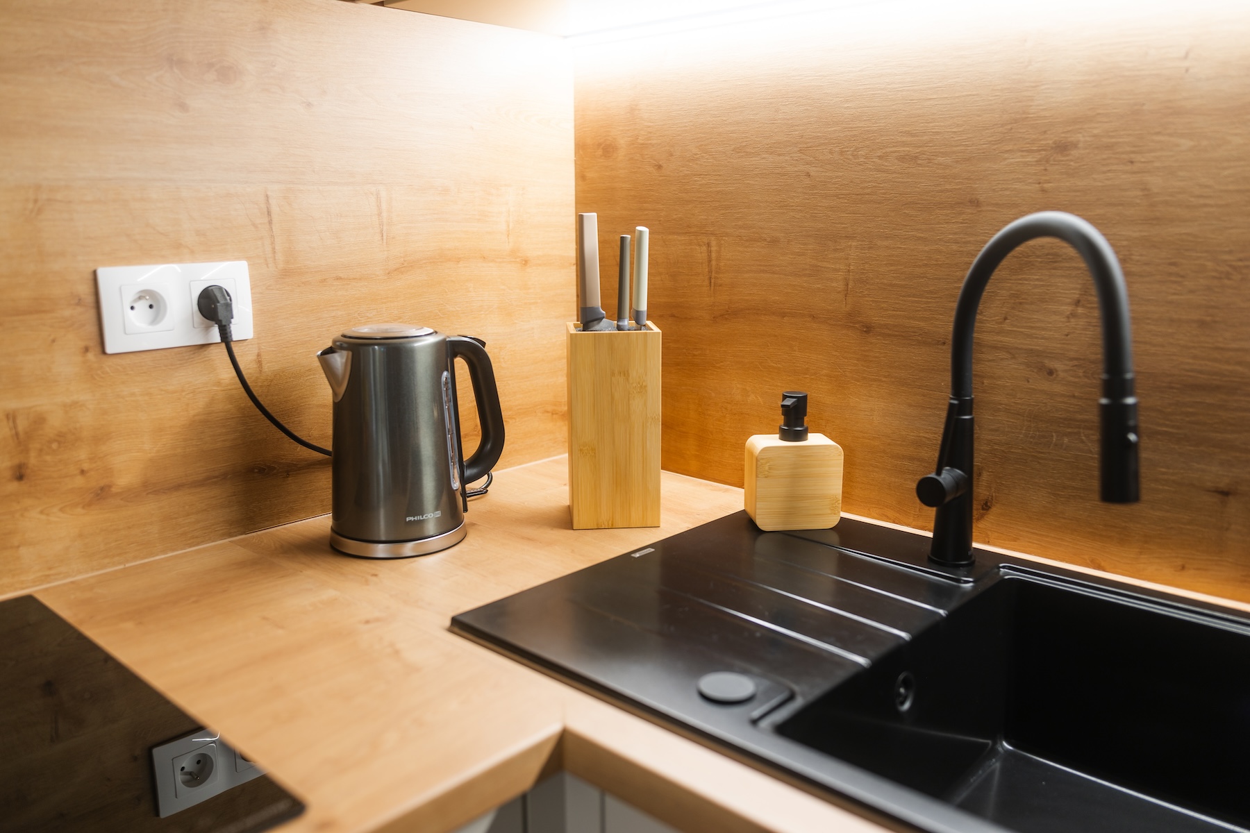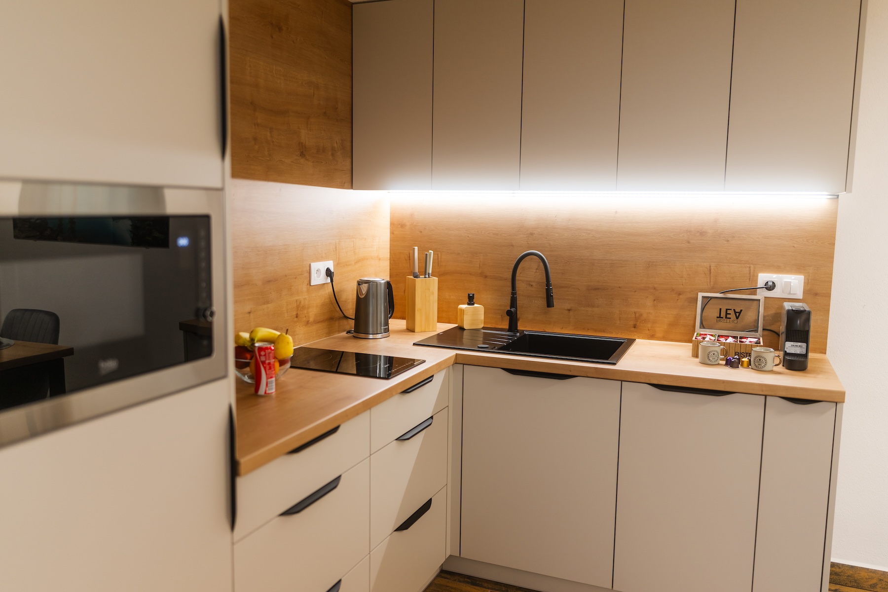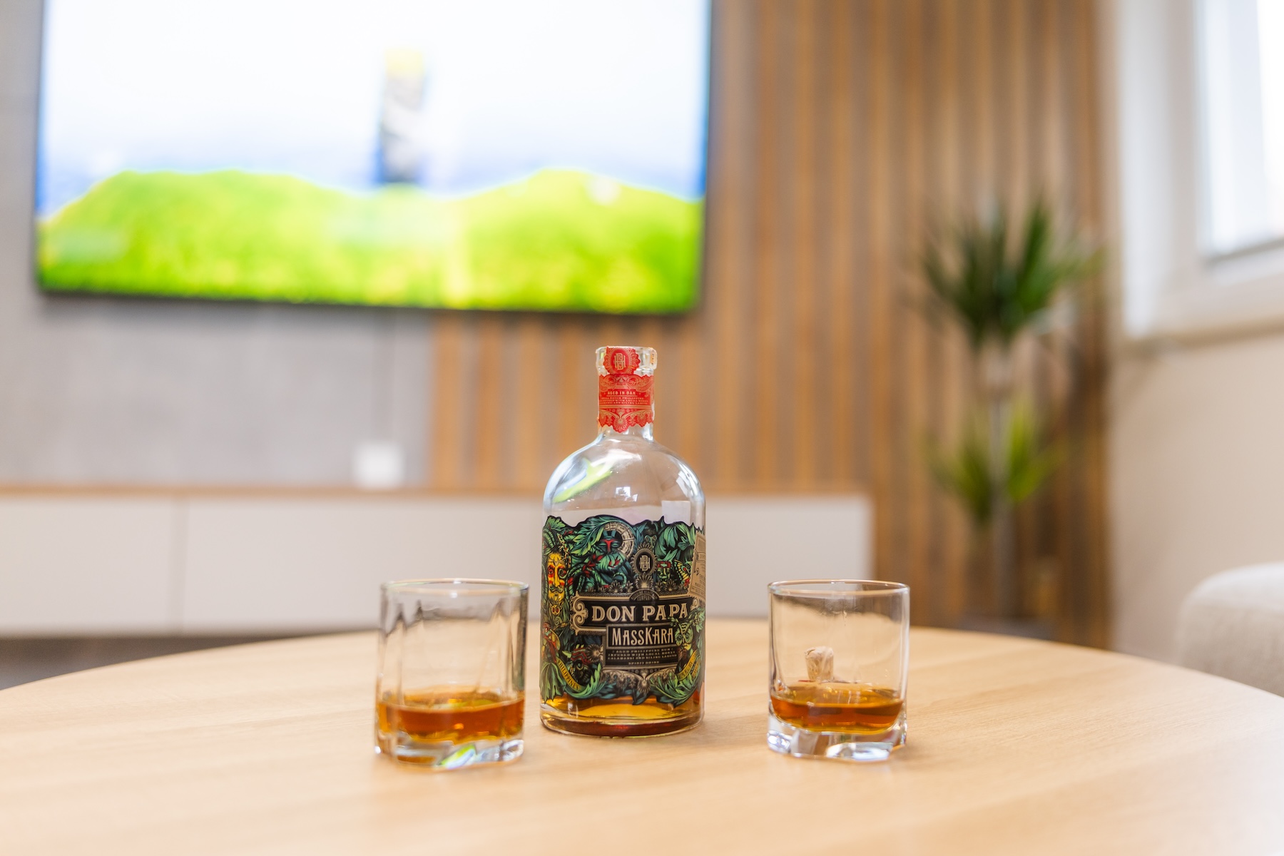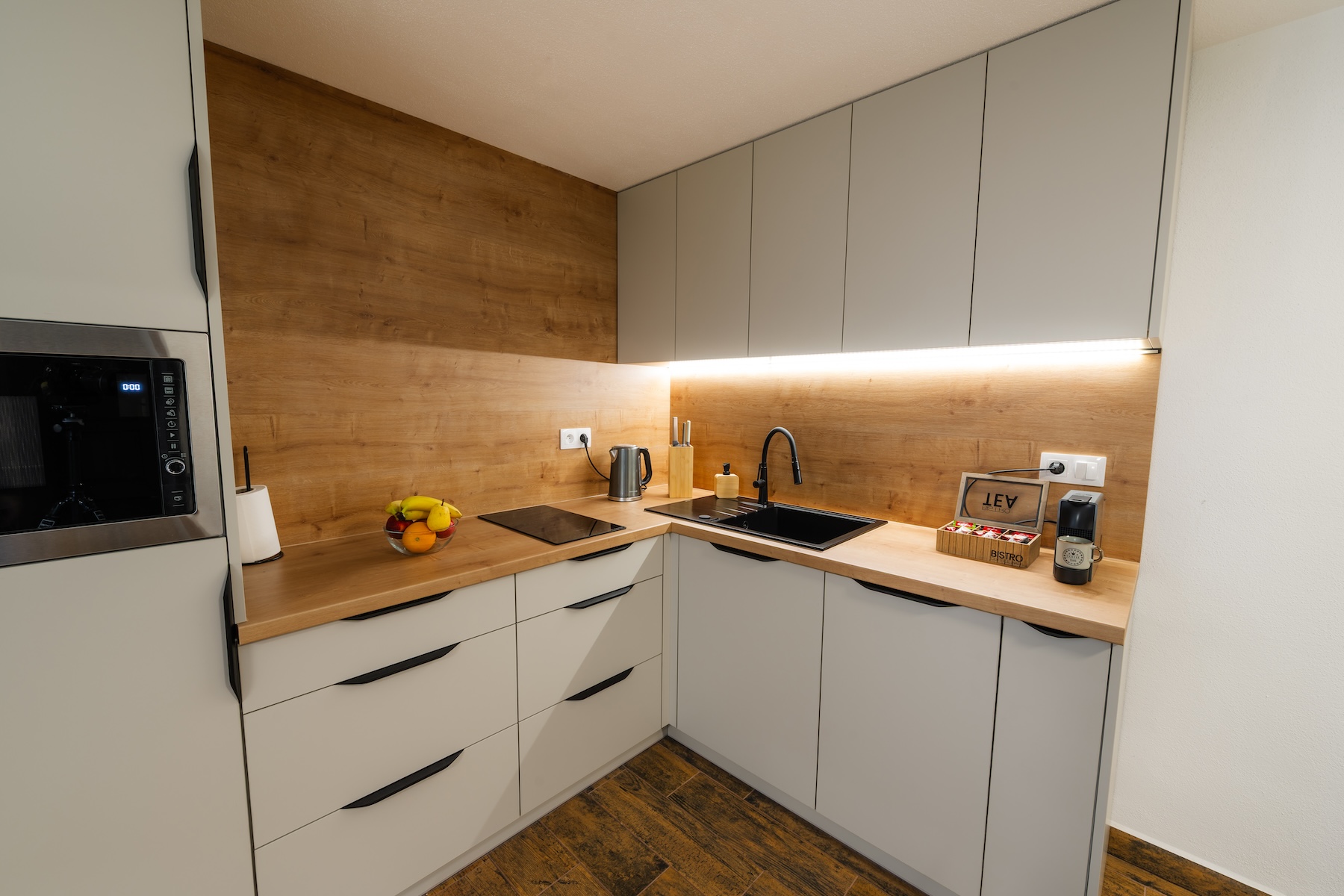Apartmán Vám celoročne ponúka ubytovanie s kapacitou 3 dospelé osoby, prípadne 2 dospelé a 2 malé deti. Súkromie Vám poskytne presvetlený výklenok, v ktorom sa nachádza pohodlná vyvýšená manželská posteľ. V otvorenom priestore je gauč, s výhľadom na televízor, ktorý v noci po rozložení slúži ako plnohodnotná prístelka pre 1 dospelú osobu, prípadne 2 menšie deti. Počas pobytu máte k dispozícii komplet zariadenú kuchyňu s kávovarom, určite oceníte možnosť využiť minibar s rozmanitou ponukou alko a nealko nápojov. Najmä večer oceníte efektné podsvietenie celého priestoru.